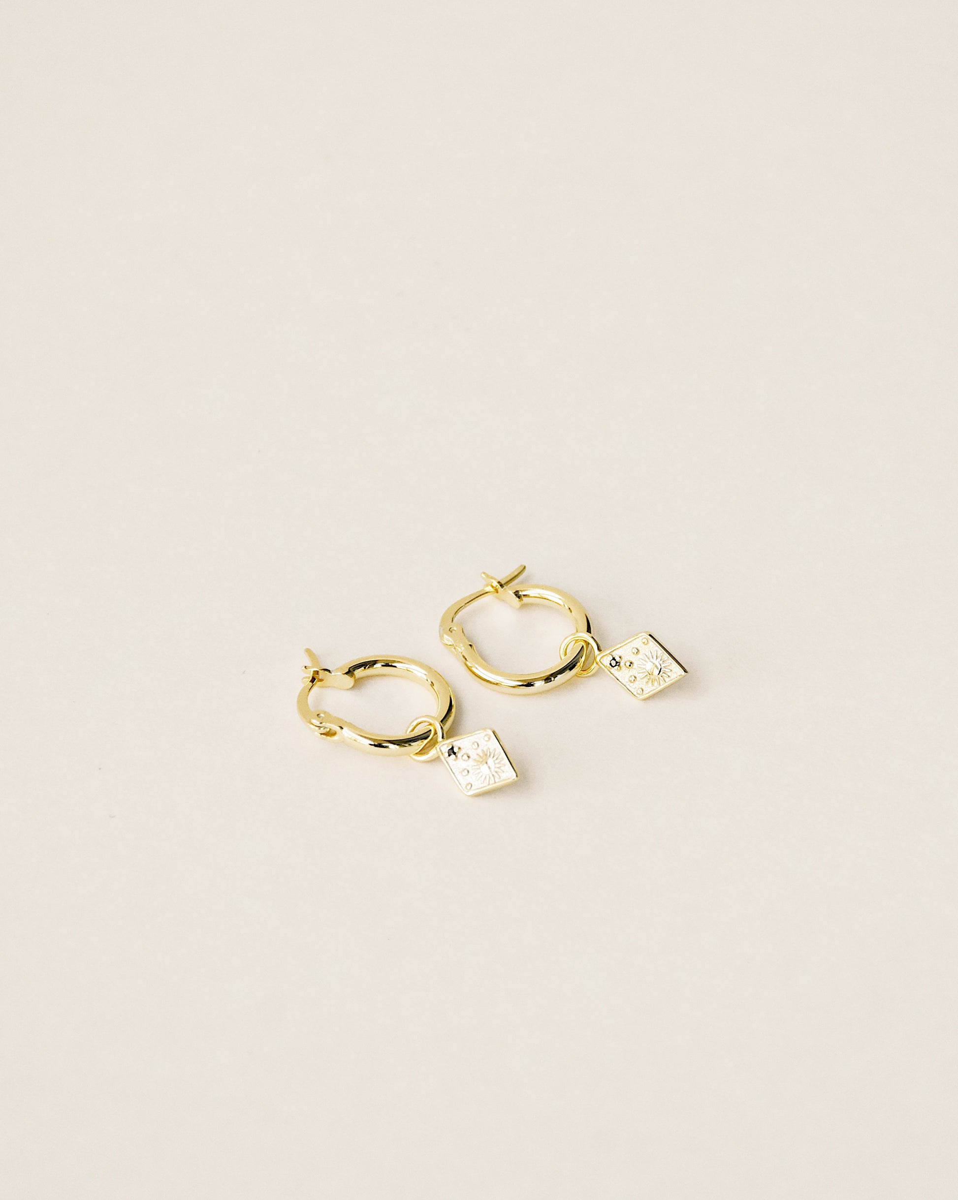 Beautiful and eye-catching rhombus shaped charms featuring an engraved sun with encrusted tiny black onyx. These dangle earrings will look awesome alone or stacked with simple hoops/studs or other black onyx jewelry.