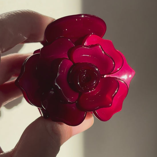An elegant acetate hair claw inspired by a blooming flower, with delicately sculpted petals finished in a soft pearly, satin sheen.