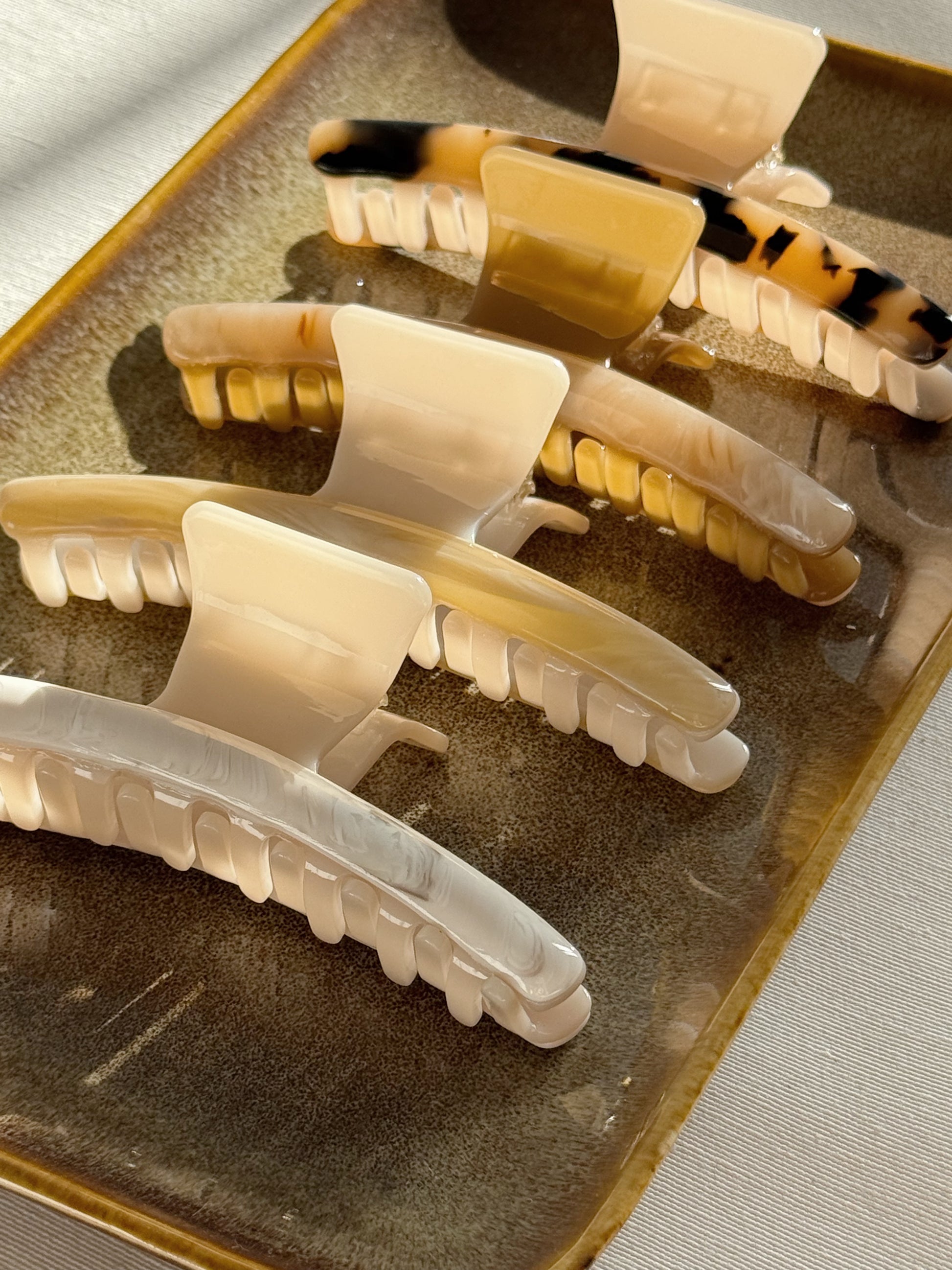 To ensure you keep your hair claw in excellent condition we recommend to securely store it when you are not wearing it and clean it regularly with lukewarm water and gentle soap to remove hair oils and dirt.