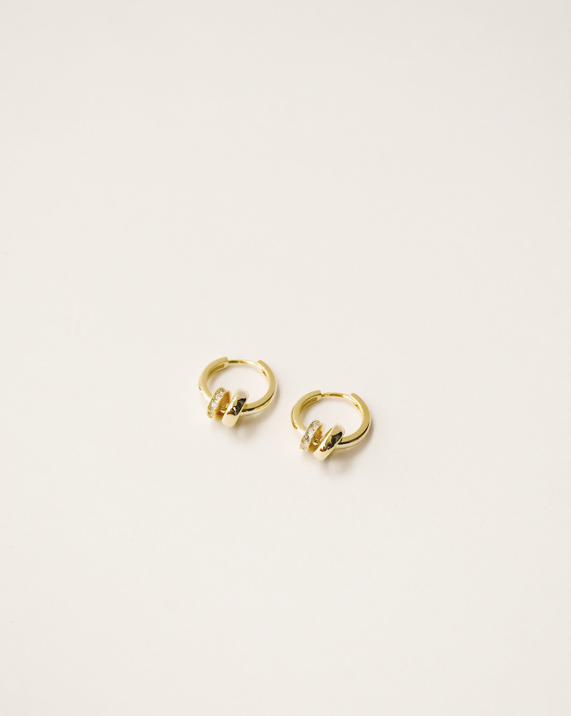 Delicate and beautiful basic huggie hoop earrings featuring 2 tiny round charms, one of them covered in sparkly high-quality cubic zirconias. They are perfect for both, first and second piercings and look so pretty stacked with any of our zirconia earrings.